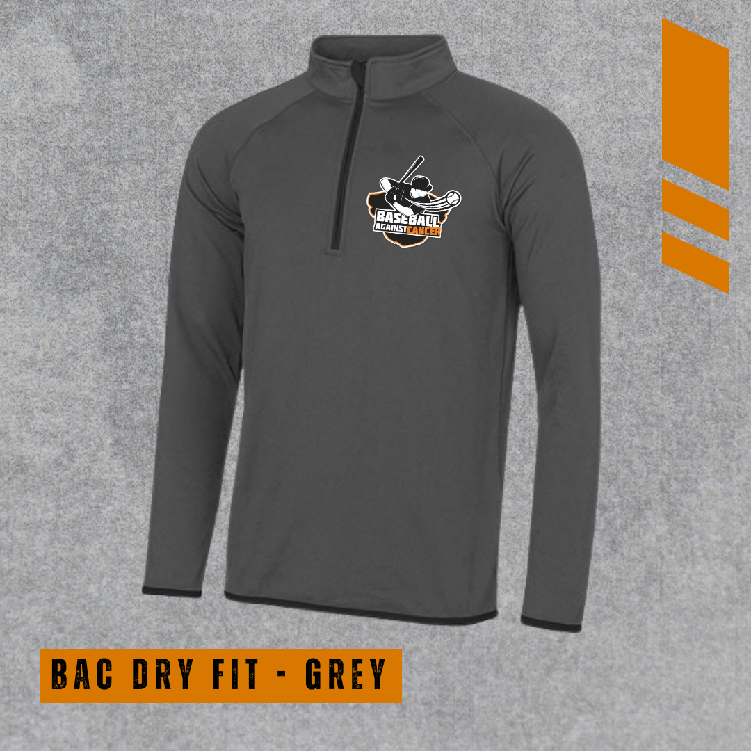 De nieuwe dryfit sweater van BAC met rits, borstlogo en subtiel watermerk logo op de rug. Heerlijk voor de zomeravonden of tijdens het sporten.