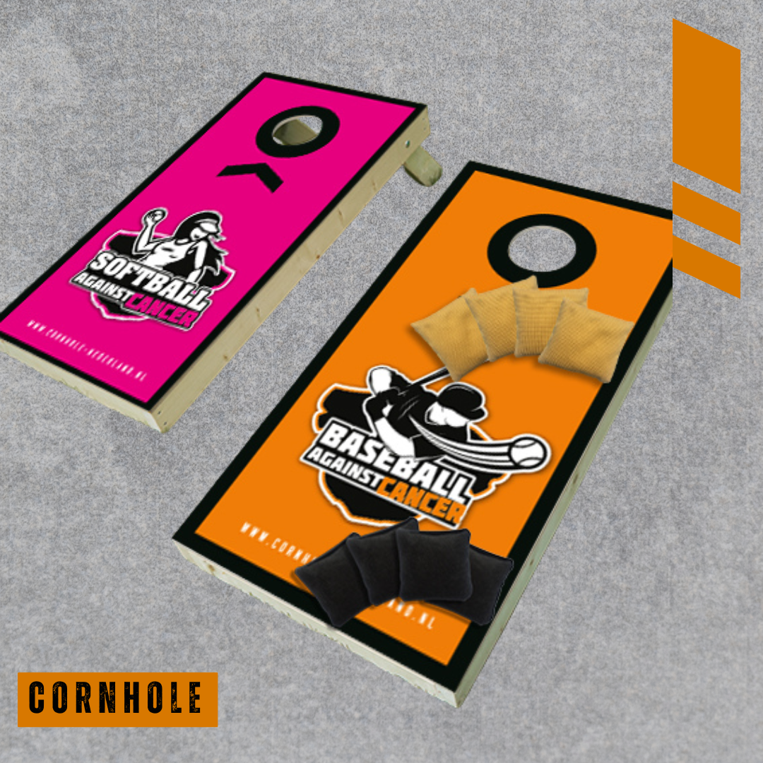 Een Cornhole spel met het kleurrijke en trendy Baseball- en/of softball against cancer logo. Een leuk spel voor alle leeftijden voor bij de kantine of bedrijfsevenement. Bestel het spel en u zult zien dat het een groot succes is. Verkrijgbaar in 2 x Baseball, 2 x Softball of een mix. Incl. 8 werpzakjes.