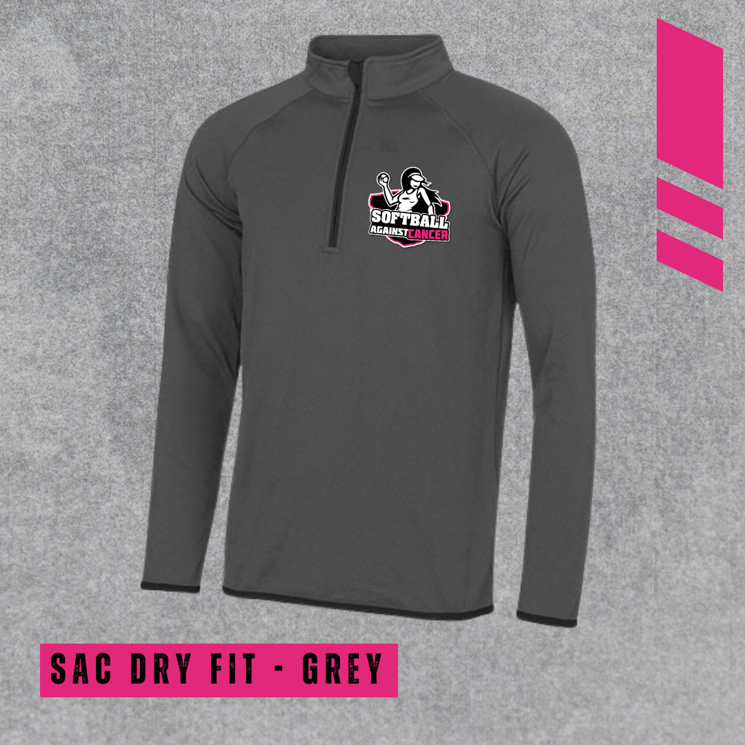 De nieuwe dryfit sweater van SAC met rits, borstlogo en subtiel watermerk logo op de rug. Heerlijk voor de zomeravonden of tijdens het sporten.